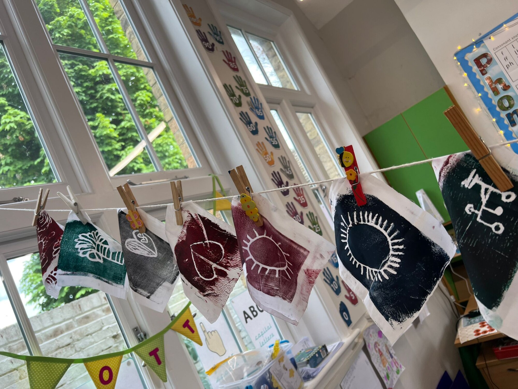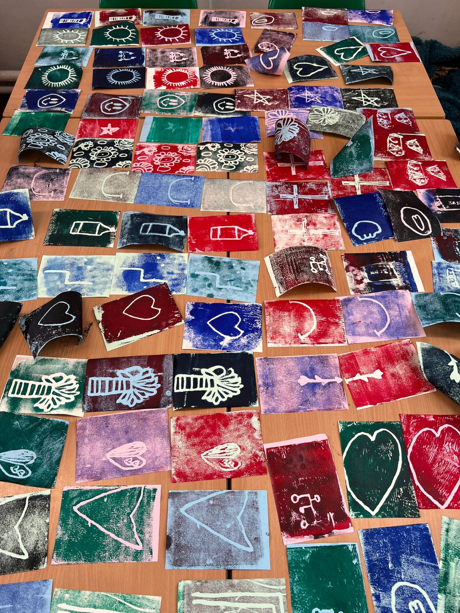 Year 2 - Drawing and Printing Year 2 have explored drawing and printing. They begin this project by looking at the mono prints of Xgaoc'o X'are and then create their own monoprints. They then look at heritage and identity in art around the world. Exploring the work of Bhajan Hunjan. Bhajan often uses repetition and motifs/symbols/shapes that draw upon both her Sikh heritage and fine art abstraction to encourage viewers to reflect on social, spiritual and emotional environments. Pupils also look at Adinkra are symbols from Ghana which can often be found on pottery and textiles. From their time exploring artists and symbols, pupils then designed their own symbol to represent themselves and their family. They used intaglio printing to print onto paper and fabric.