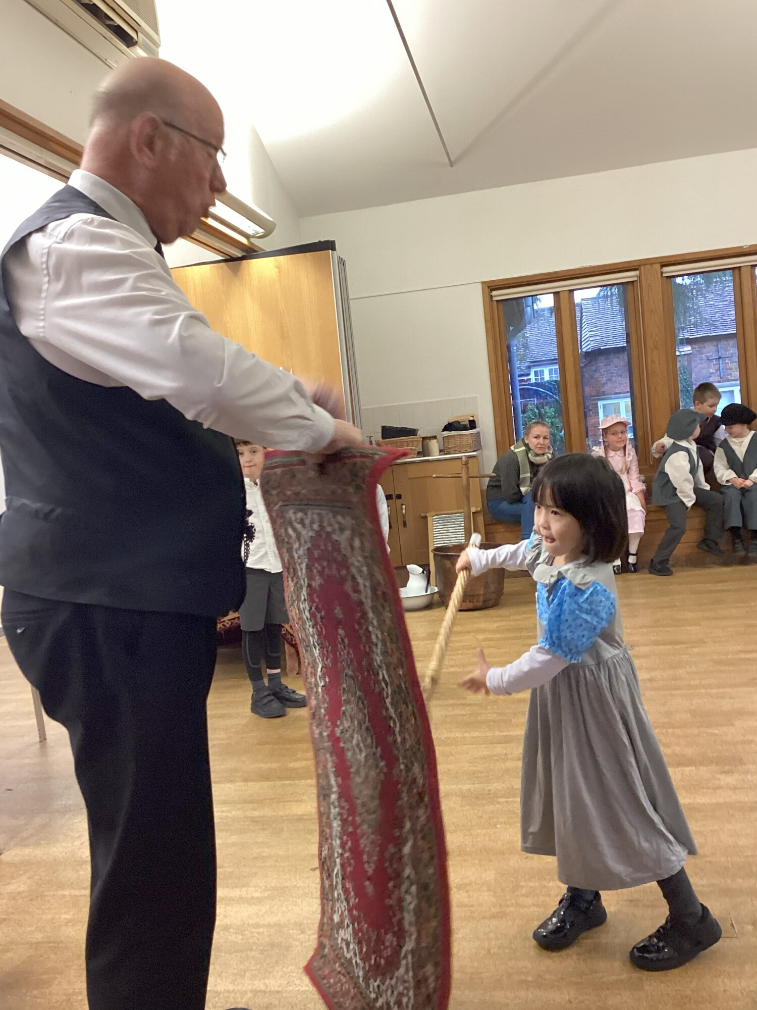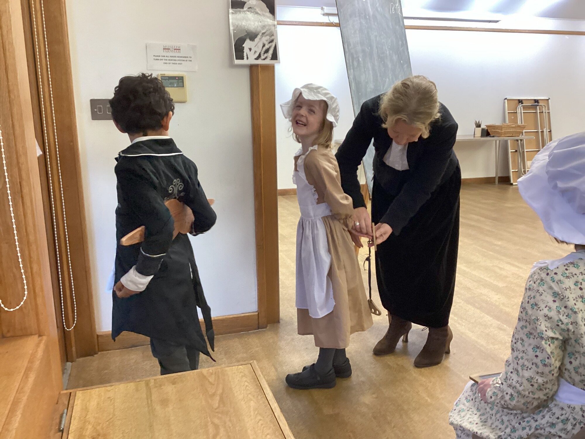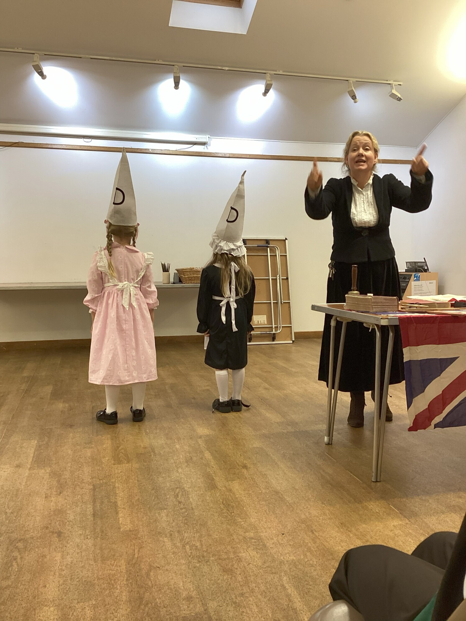 Butterfly Class looked fantastic as Victorian school children when they visited the Farnham Museum. They were interested historians at their strict Victorian school: using chalk and slate, dip pens, performing exercise drills and learning about the Victorian period. During the session, the children used Victorian artifacts, to role play a variety of day to day tasks. (Jan26)