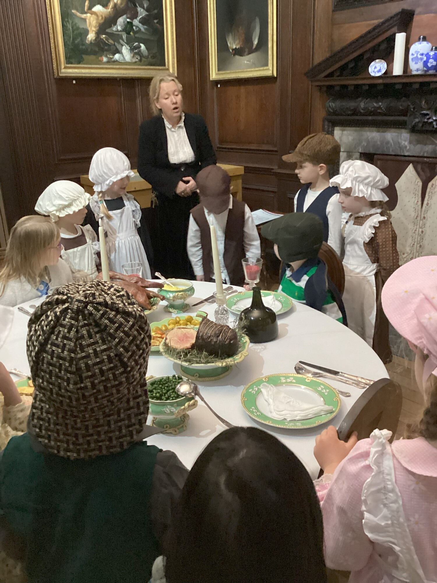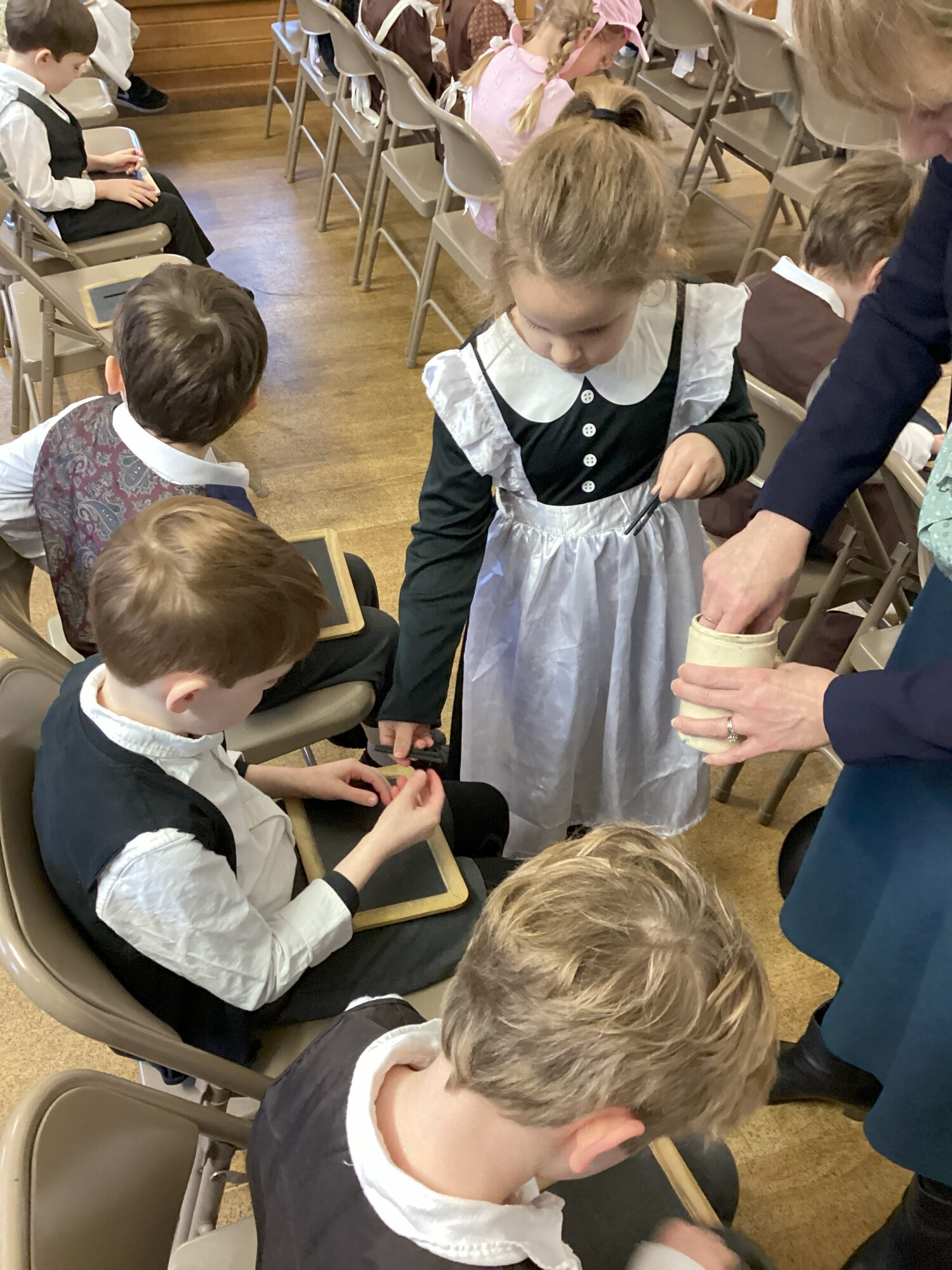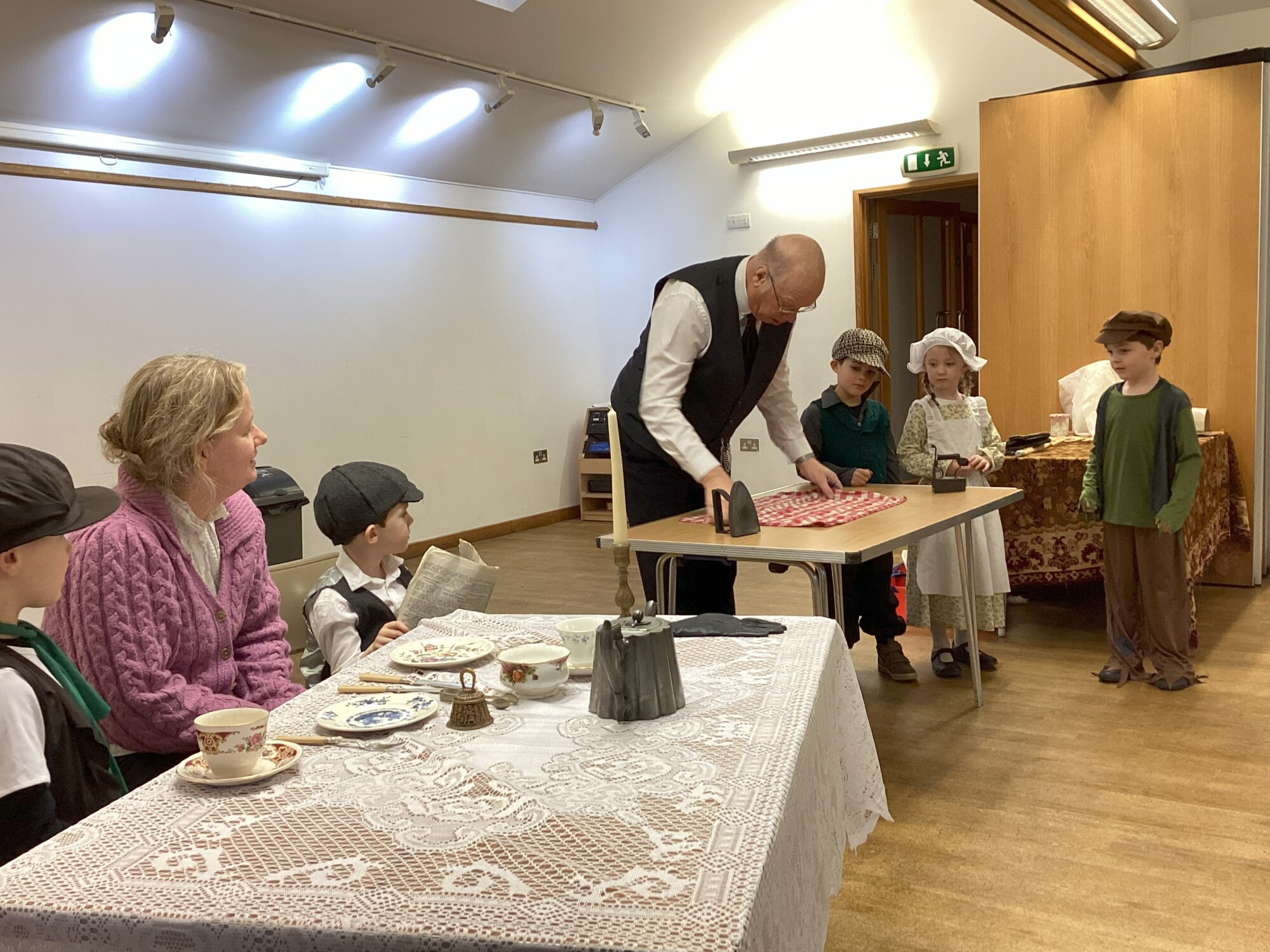 Butterfly Class looked fantastic as Victorian school children when they visited the Farnham Museum. They were interested historians at their strict Victorian school: using chalk and slate, dip pens, performing exercise drills and learning about the Victorian period. During the session, the children used Victorian artifacts, to role play a variety of day to day tasks. (Jan26)