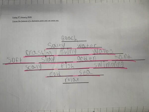 Year 2 having been developing their poetic skills looking at different types of poems. This is an example of one of our diamanté poems about the beach (Jan26)