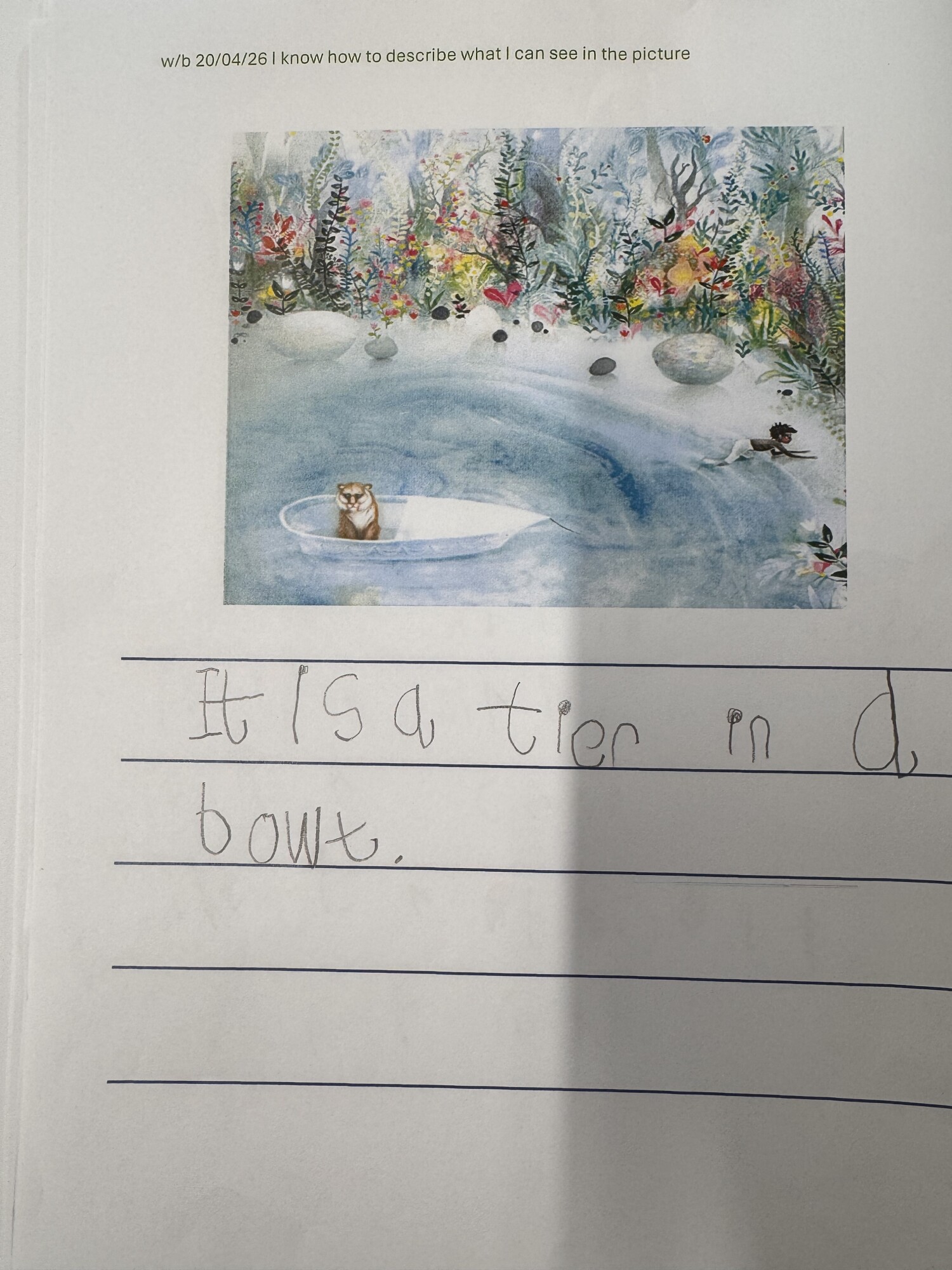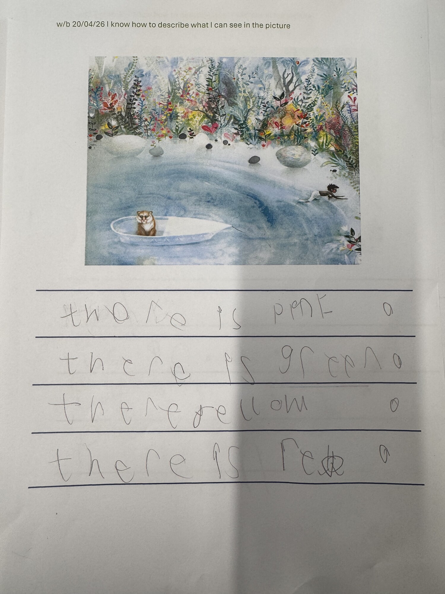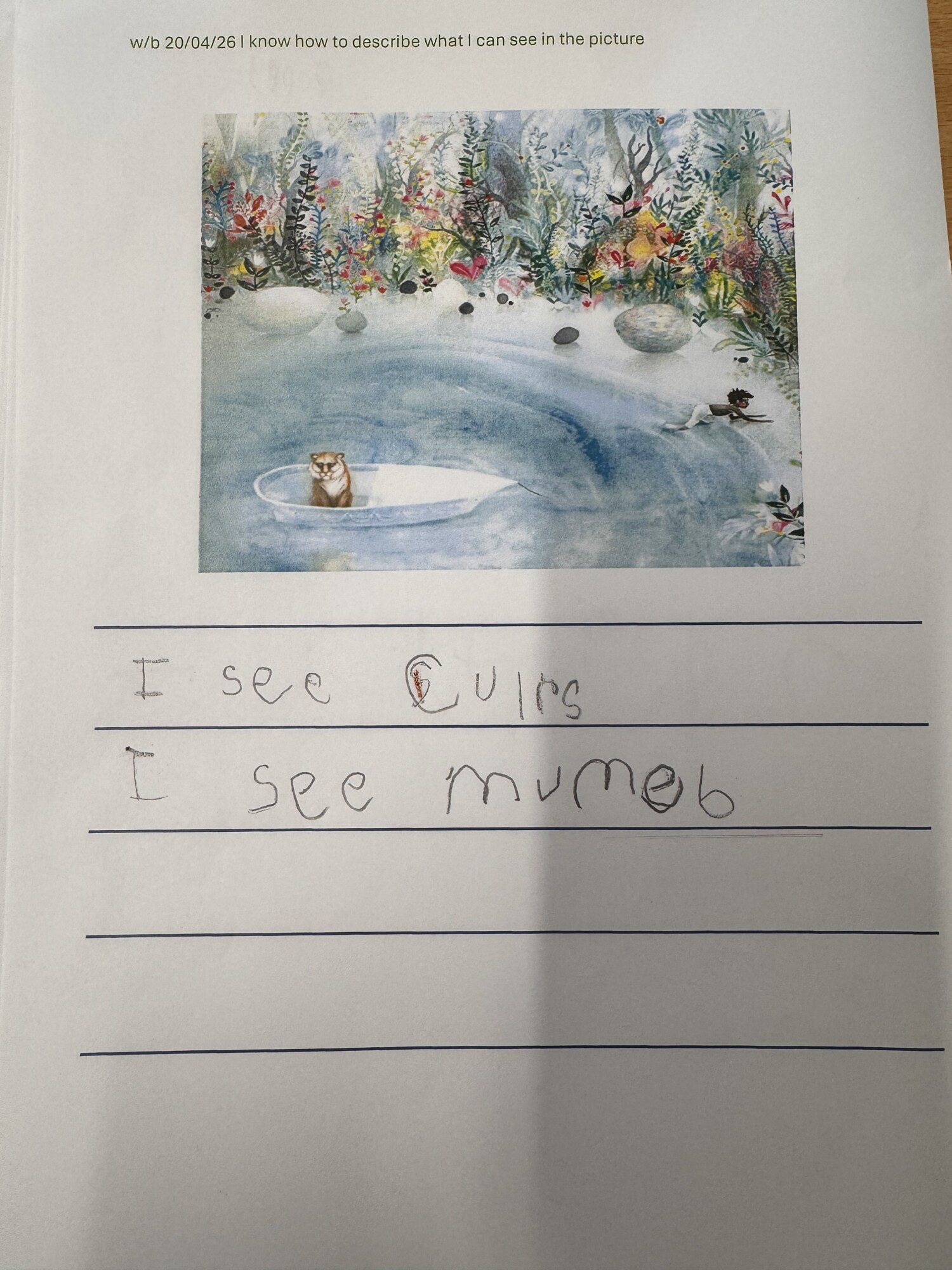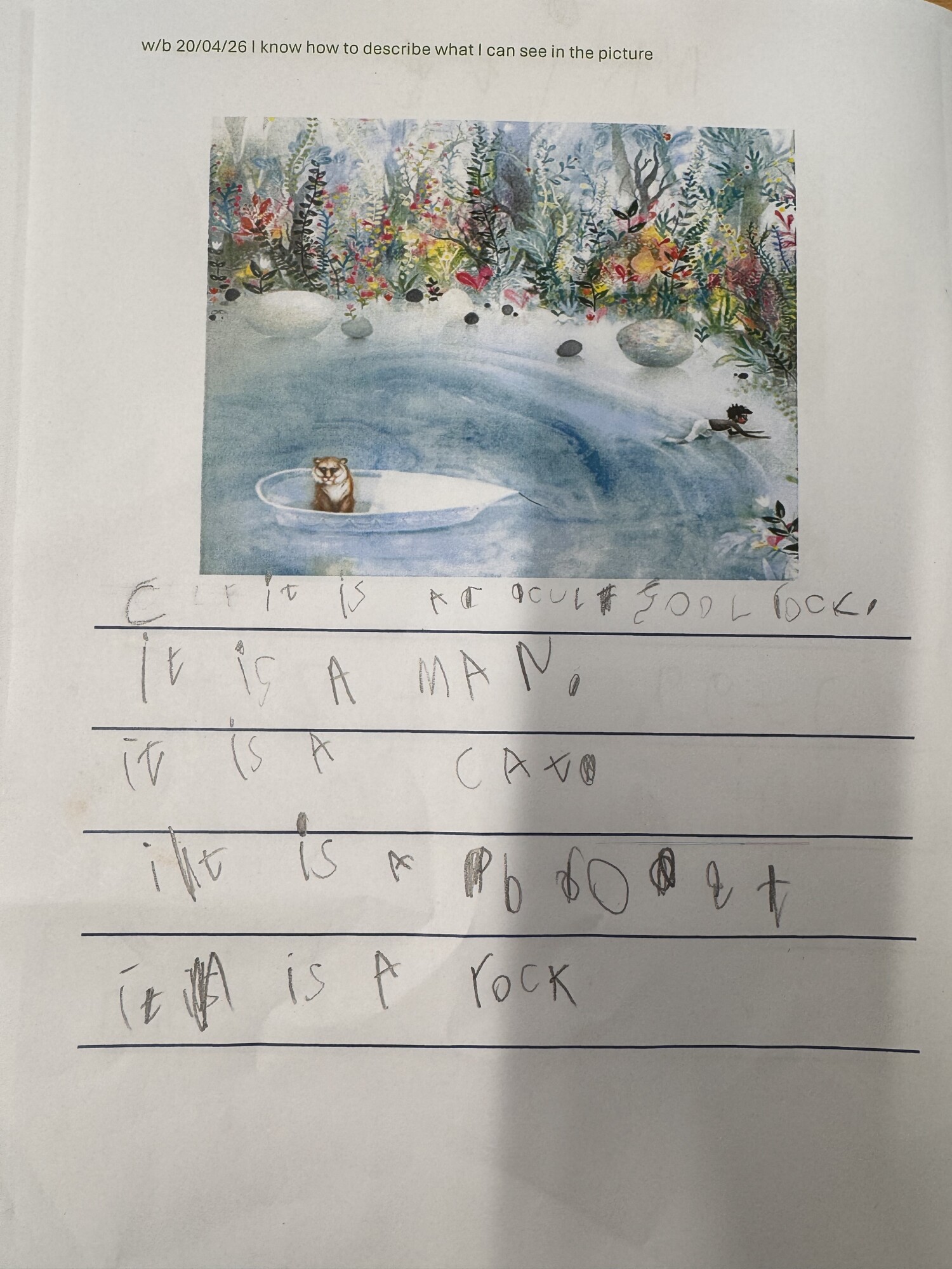 We have been learning to look at images and carefully notice different details within them. In Drawing Club this week, we used a picture to write a description of things we could see. We noticed different colours, animals, people and enjoyed having a go at independent writing. (April 2026)