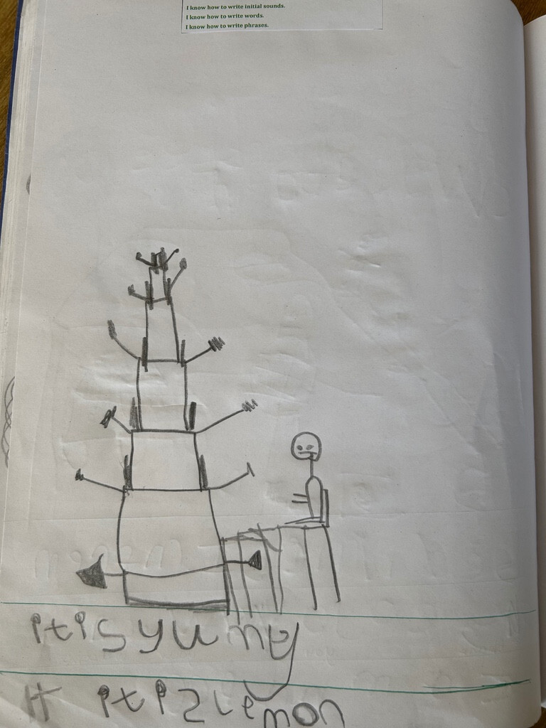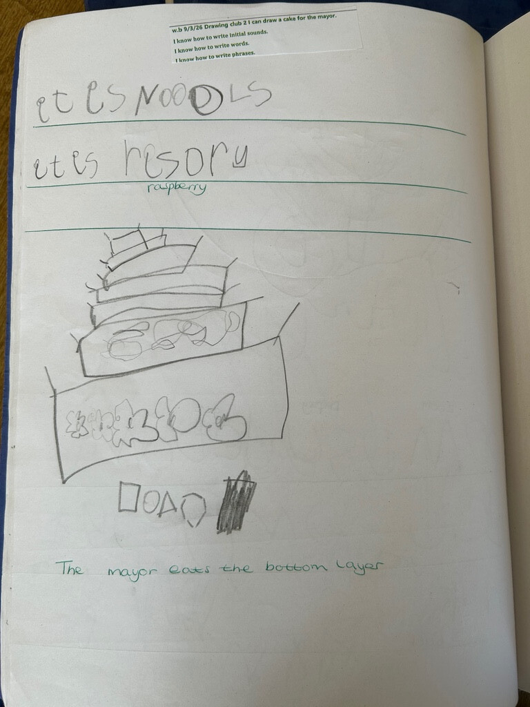 Cake for the mayor- in our story, 'Dinosaur Firefighter', the Mayors cake was ruined. We drew a new cake for the mayor in Drawing Club and wrote sentences. (March 2026)