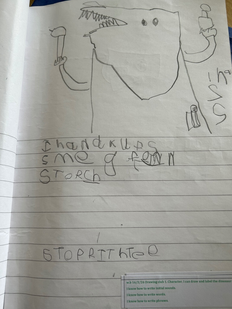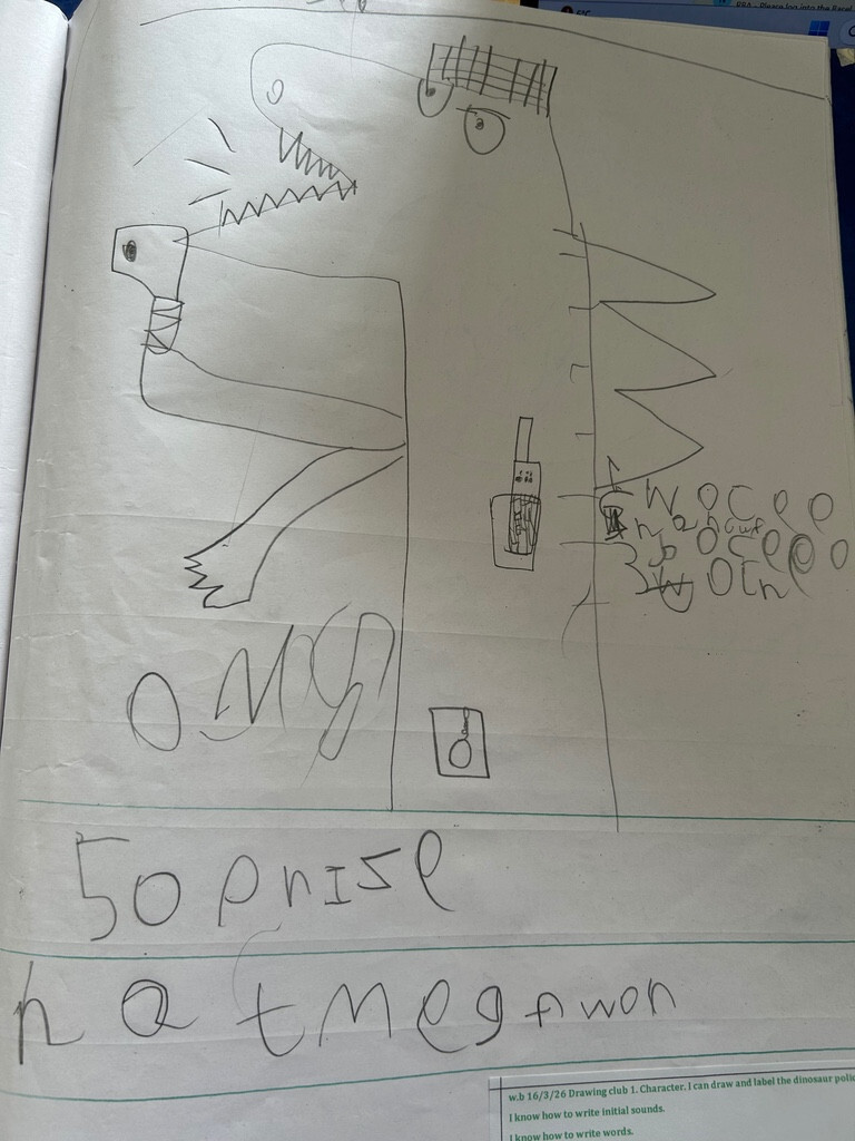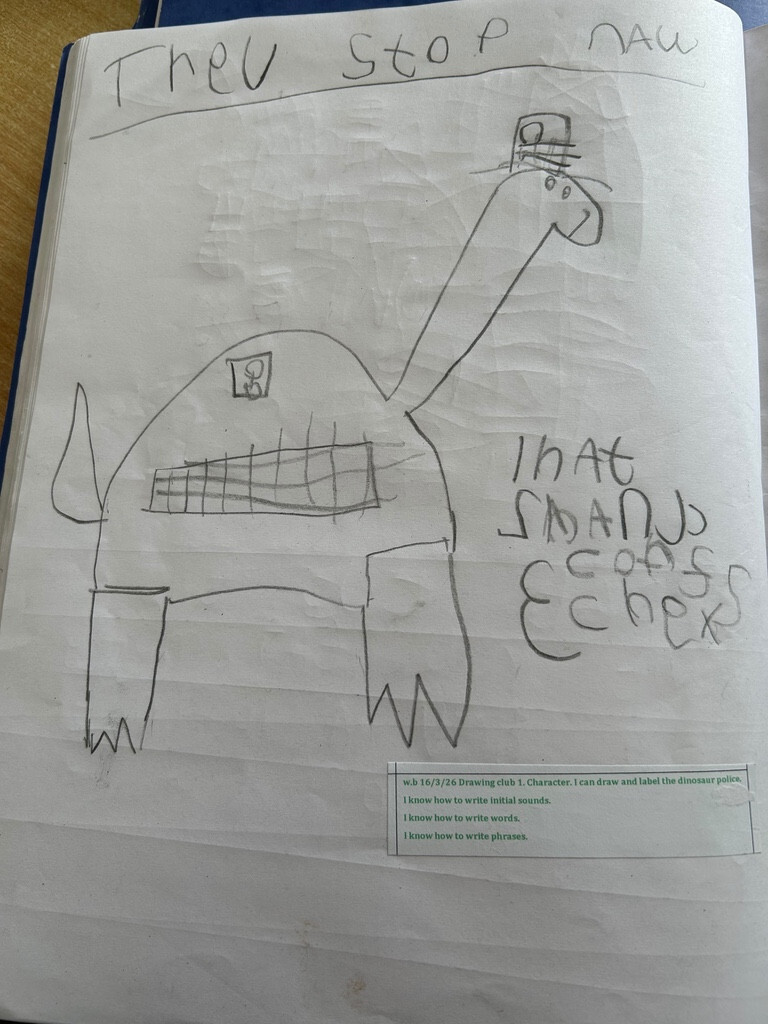 We have also enjoyed the story 'Dinosaur Police'. In Drawing Club, we drew our own dinosaur police and wrote sentences about them. We also learnt how to write a list. We listed some of the equipment our dinosaur police would need. (March 2026)